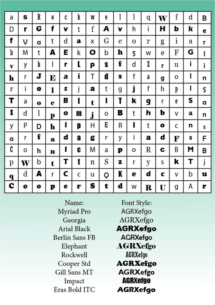 To celebrate the variation, diversity, similarities and differences between the different fonts and typefaces i came up with the idea of creating a wordsearch with some of the fonts i have looked at and used, the idea being that the player must find the font name in that specific font in the wordsearch.