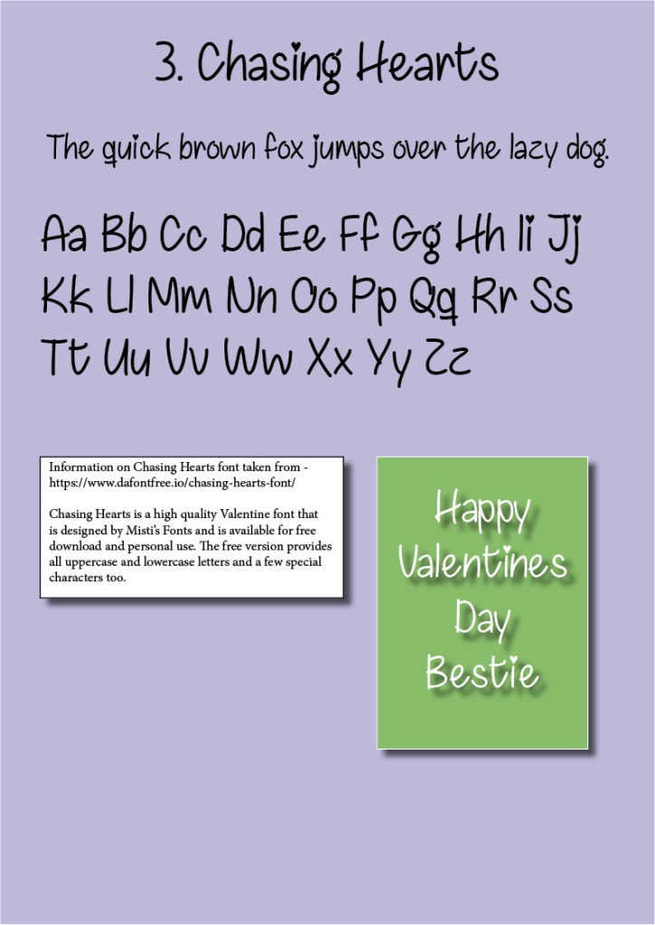 With valentines day just around the corner i decided to base this exercise on 3 fonts that could be used on different types of valentines cards. One for a Heterosexual couple, one for a Homosexual couple and one between friends as everyone should celebrate who they love whether it’s a partner or not. So the three fonts i have chosen are all freely downloadable from dafont.com a very popular site where you can download all sorts of different typefaces.