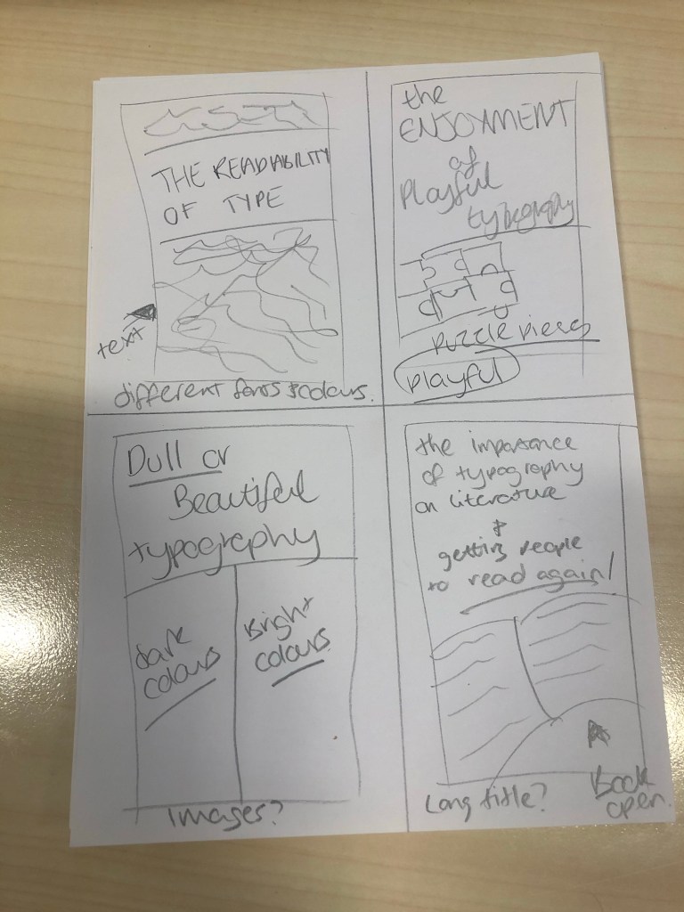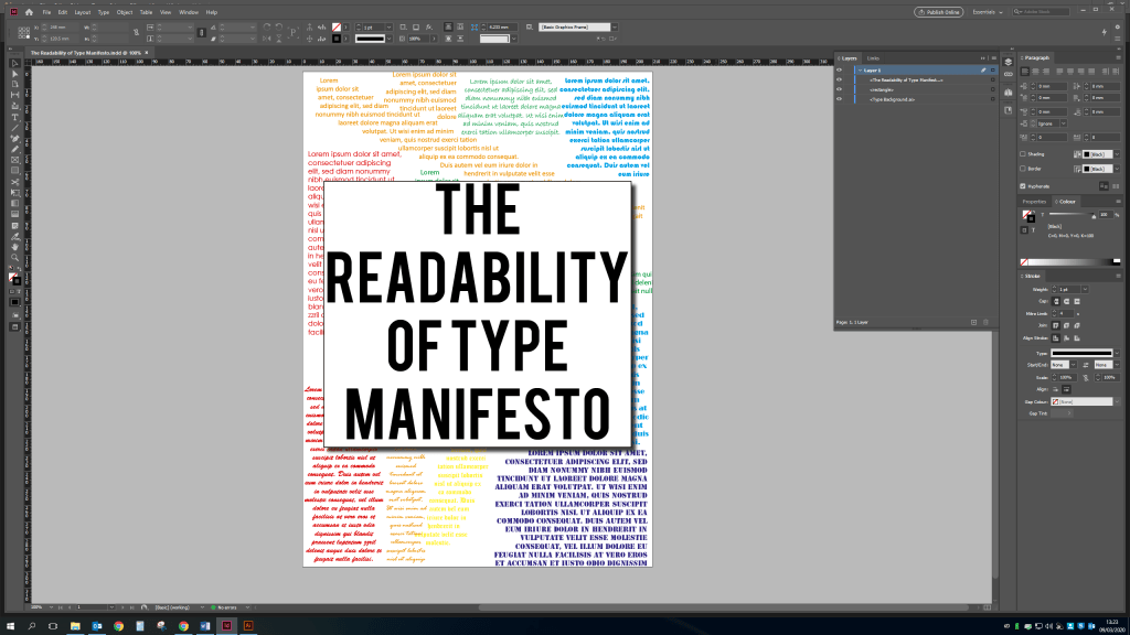 To start i wanted to focus on what my manifesto would be and what the title page would look like. So after analyzing the brief a bit more i decided to focus on ‘The Readability of Type’ looking at different fonts used to different occasions and how readable they are. I then started my work on the title page, i want to create something quite basic not distracting from the main issue but still be eye catching and visually intriguing. So after doing a few sketches and then using a mixture of adobe illustrator and indesign i have created the below. Using different lorem ipsum font types and colours to show the readable and not so readable elements of typography while displaying a bold and clear title.