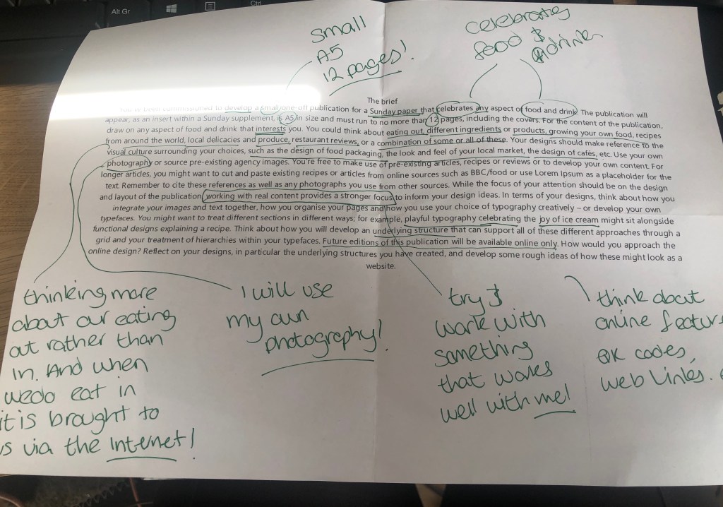 I did really love my second idea of creating a document that is shaped like food however having worked in the print industry i know how difficult this would be to achieve. So the traditional route seemed better, maybe if i was actually producing something like this i would be able to find a company that would do exactly what the client would potentially want. The bright stripes and images work really well in this more traditional layout though, still engaging and modern.
