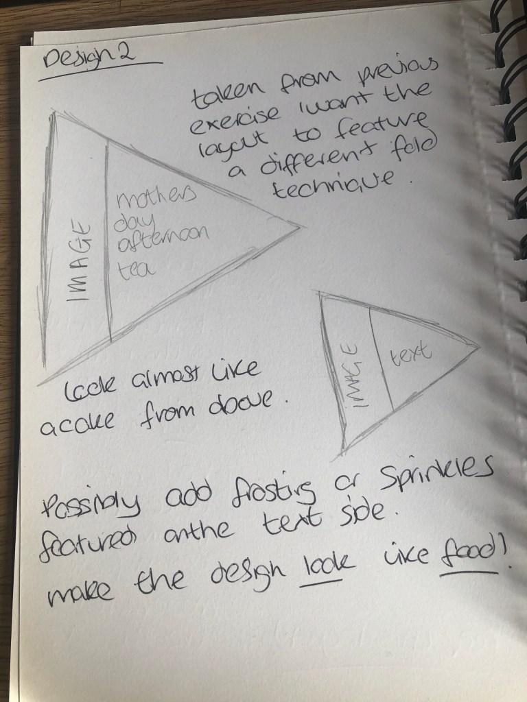 I did two designs in my sketch book, one keeping with a traditional style and page layout with text and images on separate sides along with design features in the corner of the document to continue through each page. Using a calligraphy style font for the title and a more readable sans serif style font. The second was more dynamic featuring an unusual page format in a triangle style to look like a slice of cake commonly featured at afternoon tea. To make the document look like food seemed a good way to attract attention and look appealing, along with featuring text and images. Probably the same font style as the first design as I feel this works best with the area of food and drink I am aiming to attract.