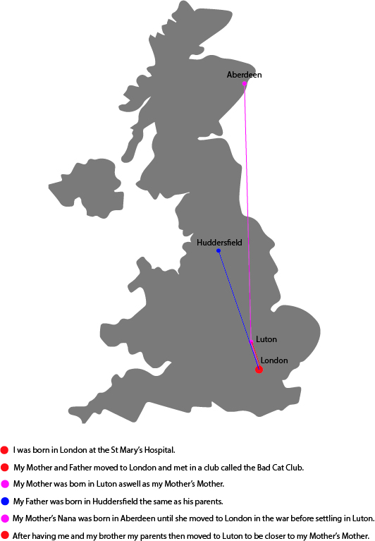 First I created a basic family tree from my little knowledge of my family history. It’s never something I’ve been interested in but i have more so since losing a lot of family members. I know that my mother and father are from two different areas in the country, my mother from Luton and then moved to London and my father from Huddersfield and then moved to London where they met and had two children, me and my brother.