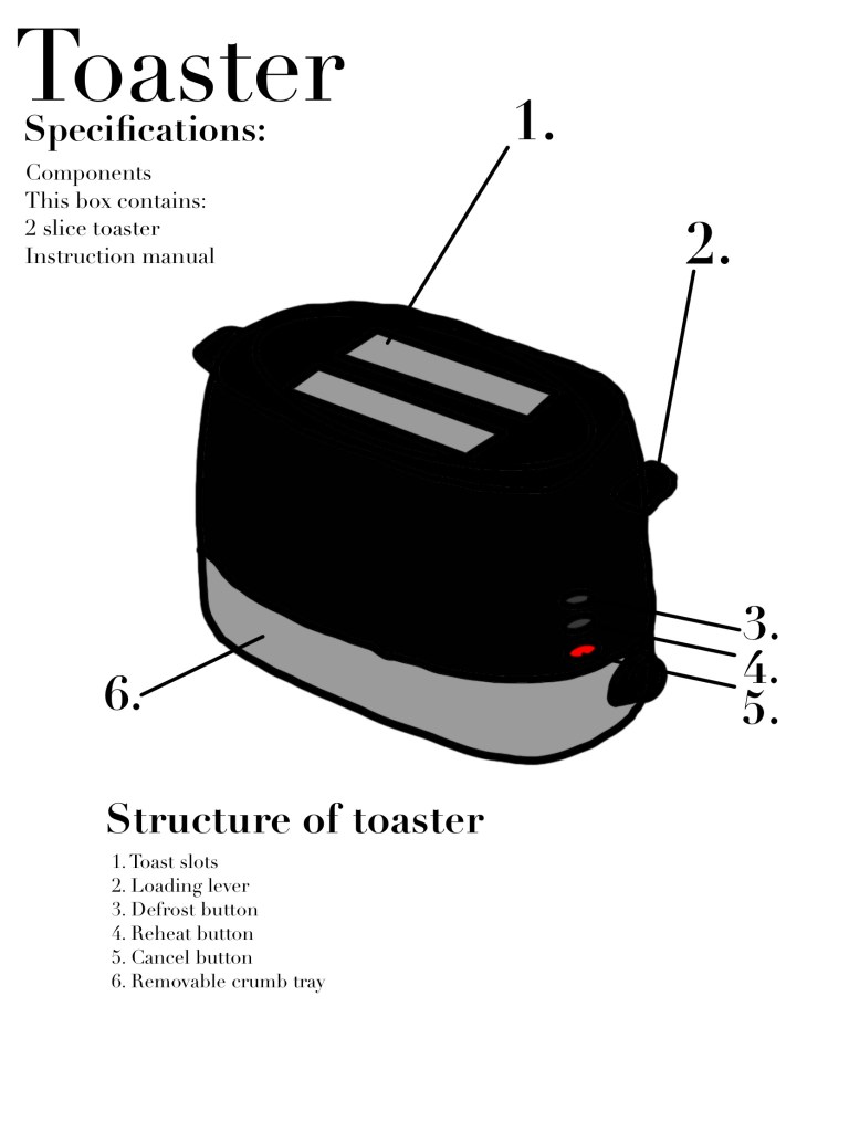 I’ve decided to use the household appliance a toaster for this exercise so I had a quick google and looked at an existing toaster manual with safety precautions inside and there was no illustrations other than a map of the toaster and what everything does. I find this quite shocking as I assumed most manuals for appliances used symbols and illustrations to show what not to do as some things may be obvious to some but not everyone.