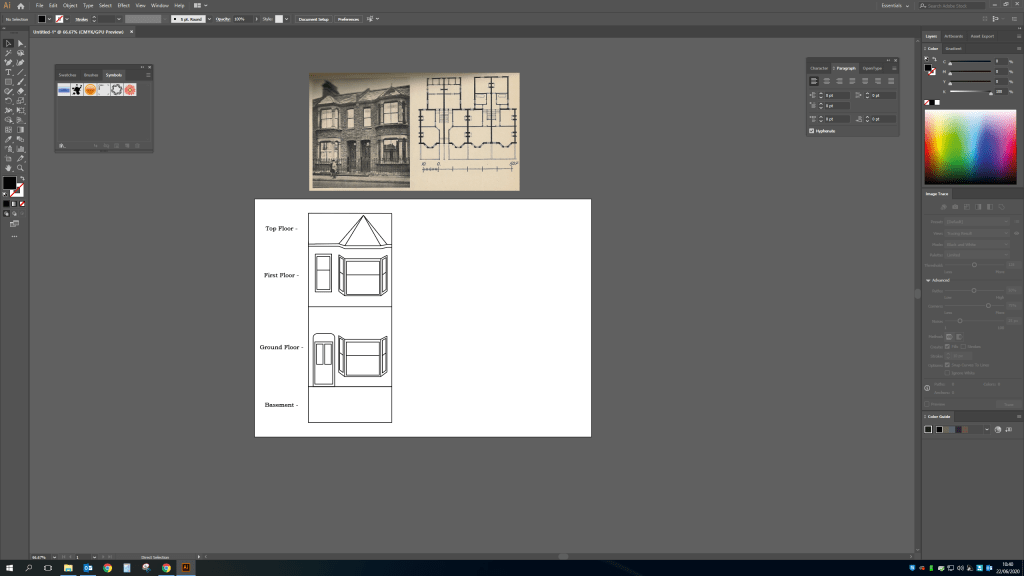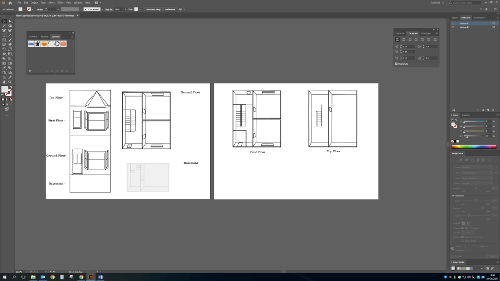 I started this exercise by doing a basic drawing in illustrator from an image of an old Victorian terrace house labeling the different levels of the bookshop.