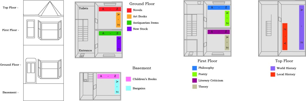 See below the finished piece i’ve kept this very basic and easy to read but still shows the elements of the house and where bookshelves are and what sections are where. I wanted to keep sections to only two areas per room, with the current social distancing rules implemented for the foreseeable future i think it’s important to keep people apart as much as possible, that and long term i find it easier to find things i want when i know exactly where to go for example if i was looking for Novels i know to go into the back room on the ground floor, back shelf. Almost like if i looked on google to see where a certain shop was and how far i need to walk/drive to get in and out quickly as possible.