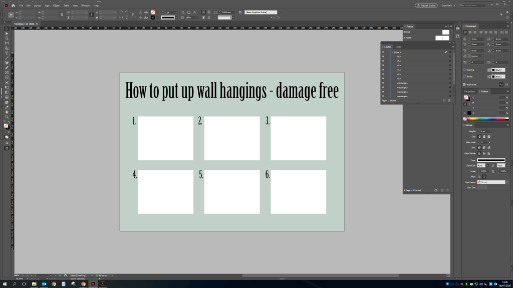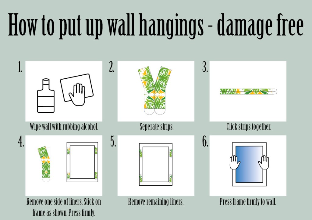 First i needed to decide on layout, traditionally instructions are white background and simple text which i do want but i also want this to look visually aesthetic too. So i decided on the below font and page layout with 6 steps to hanging up wall decorations damage free. The text is nice and thin but easy to read alongside a mint green background with white squares clearly displaying each step.