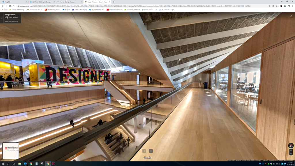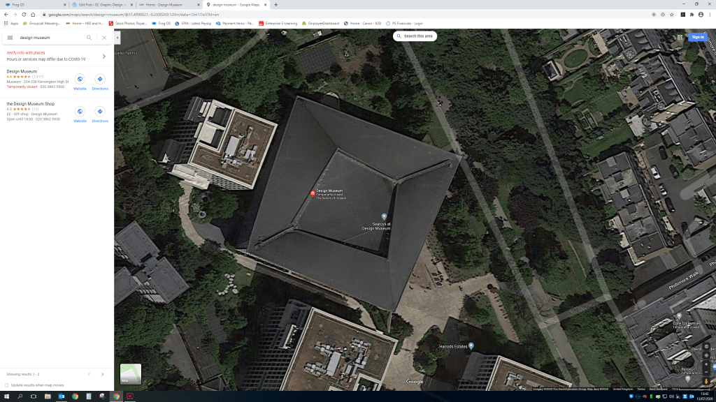 As the design museum is currently still closed while we are in a global pandemic of coronavirus unfortunately i cannot visit the museum and all it’s glory. So a google map view is the best i can do at the moment to develop ideas for the map layout.