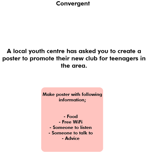 It’s quite clear from doing this exercise that depending on the notion of the brief as a graphic designer you need to be able to think like both a divergent and a convergent. In this case the client appears to know exactly what they want so be a convergent thinker and get the job done asap. However i feel it’s always worth asking the questions like a divergent thinker, is the client sure this is how they want to display the information, maybe give the client various options before they make a decision. It’s always worth speaking to the client and making sure they are clear and concise with their demands and what would be best for their needs.