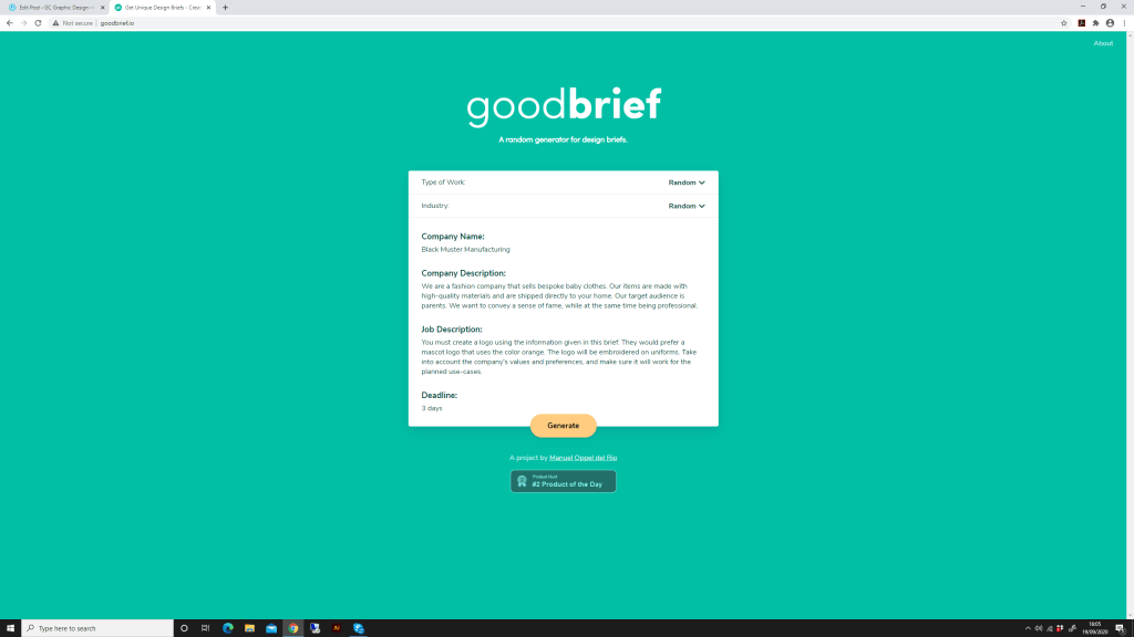 My first design I have used Adobe Illustrator to create an advert for myself as a graphic designer. I have used a bright background and coinciding colours for text and a logo I have quickly created. I have matched the fonts, using only two as using too many looks overcrowded and I want to create a brand. I have listed my capabilities using hexagonal bullet points in different corresponding colours to my logo. The design is simple and clear while being bright and appealing to my audience. For me as a designer and avid social media user I find I have more design capabilities in Adobe Illustrator to create a more striking and involved piece of work. To create something a bit more animated I could have dropped this page into Adobe after Effects but did not feel this was necessary for an advertisement of this style.