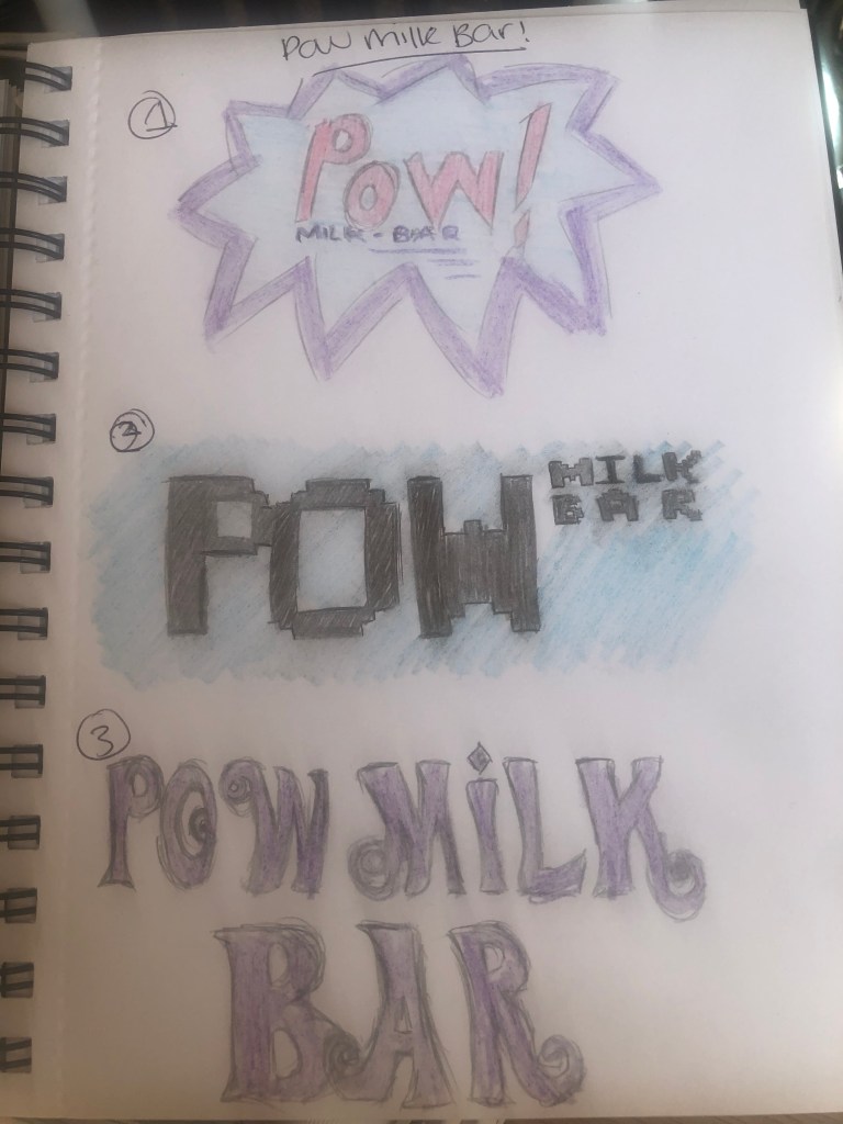 Firstly i made a decision to use purple and blue colours as these are not often used to associate as retro but are associated with chocolate particularly the purple for ‘dairy milk’. The first design i stuck to the pop art style featuring the POW as the main word and then the milk bar text below. It looks very appealing and certainly retro. The second i thought more about the wording ‘retro’ as a few months ago i went to a retro gaming weekend with pacman machines from the 80’s so i incorporated a pacman/gaming style square font which works really well and again could be used for other types of confectionery as i have moved the milk bar text to the side of the POW text and featured a small colourful pop art in the corner as an emblem for the brand. Taking the ‘retro’ style font i wanted an even older style from the 60’s as sort of a more plain design as the font speaks for itself however it doesn’t connect as well as the other two with the pop art style.
