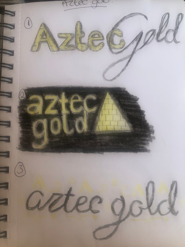 So the first design i used a standard sans serif style font for the word aztec and a more script style for the gold wording. Before then adding a block effect to the word Aztec creating a sense of depth to the logo. I also considered this as a type of brand for example if the company used the wording ‘aztec’ for another type of chocolate like white or milk etc. The second was more plain font with added imagery of a pyramid, thinking about how this could be packaged like in a pyramid style bar (Toblerone as an example) again adding the block effect to the pyramid alongside a black background and gold imagery and text. The third was more taken from googling aztec gold and the results were prominently the aztec gold coin featured in the popular film ‘pirates of the Caribbean’. So i used a script style font and added features from the coin, like hieroglyphics almost, this works really well around the text and could feature along the packaging of the bar.