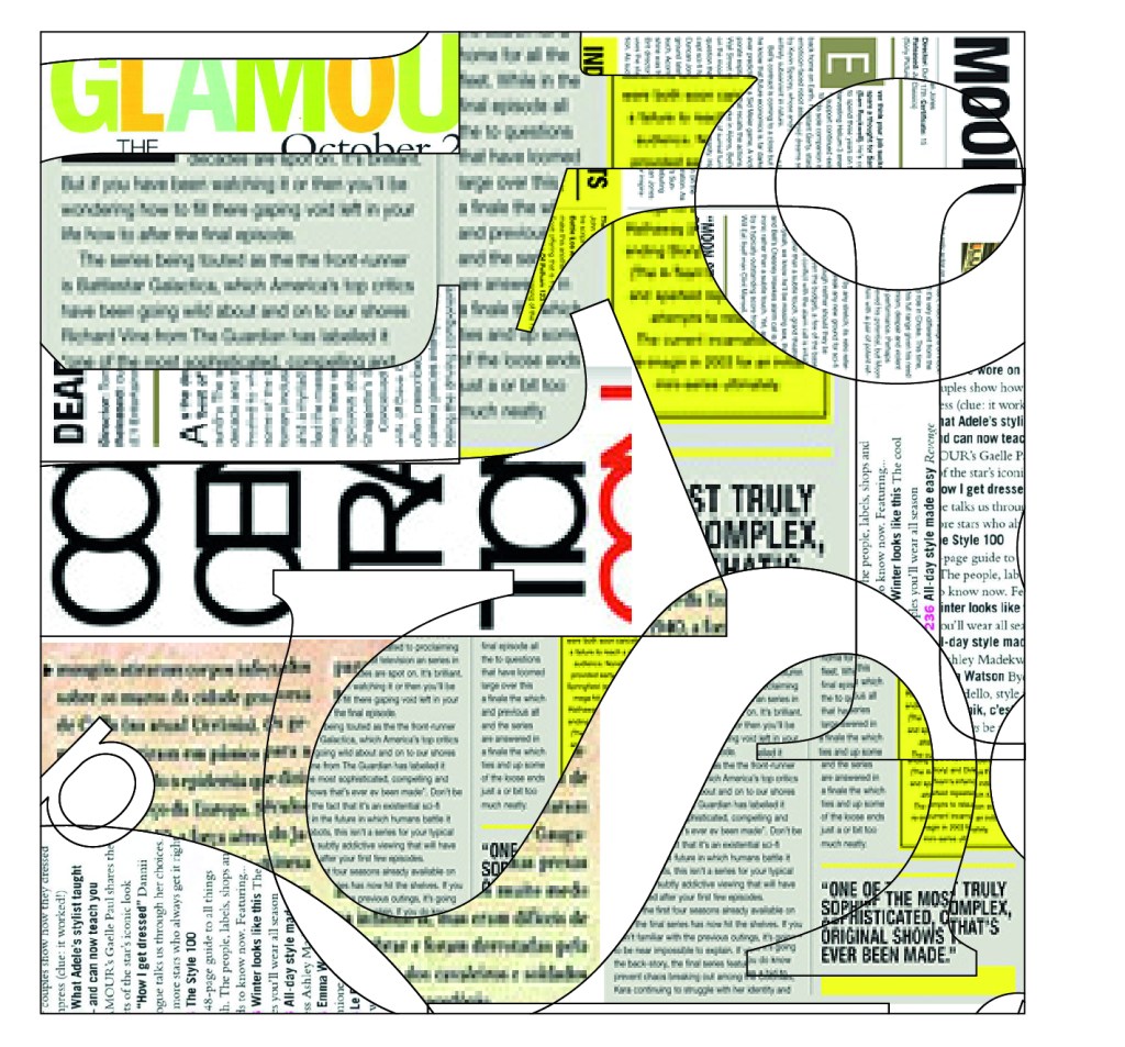 I do like the messy collage style of this however difficult it was to layer the artwork different angles and sizes to cover most of the page with still keeping the text outline around the images embedded. I found this quite difficult doing on illustrator but i wanted to try this rather than buy some magazines and cut them up into text shapes creating a similar collage to the one above. Mainly because of the time consuming aspect but also because it seemed an unnecessary expense for the planet!